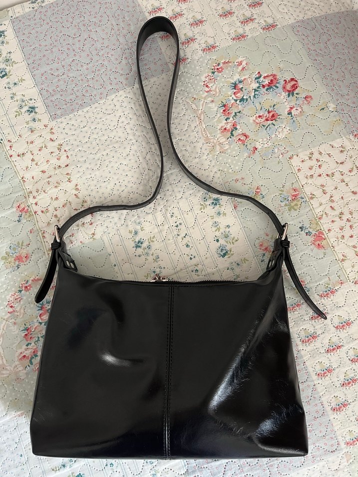 Kemer detaylı askıya sahip siyah deri kadın çantasıdır. Bir defosu yok