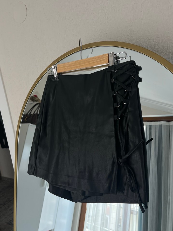 stradivarius deri mini şort etek bağcıklı