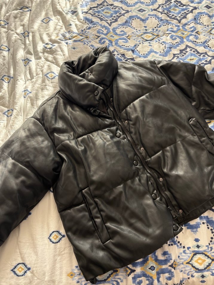 Siyah deri, düğmeli, yakalı ve midi boyda kadın mont. Bol kesim ve kayışlı kollara sahip, rahat ve şık sokak stili görünümü sunar.