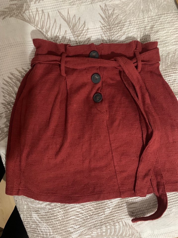 Bordo keten mini etek, düğmeli ve bel bağlamalı, bol kesim, bohem tarzda günlük kullanıma uygun. Stradivarius s beden, bir kere bile dışarıda giymedim