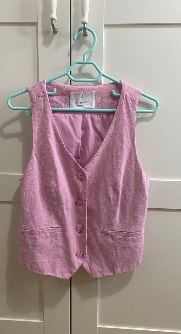 Stradivarius Düğmeli Pembe Keten V Yaka Kadın Yelek