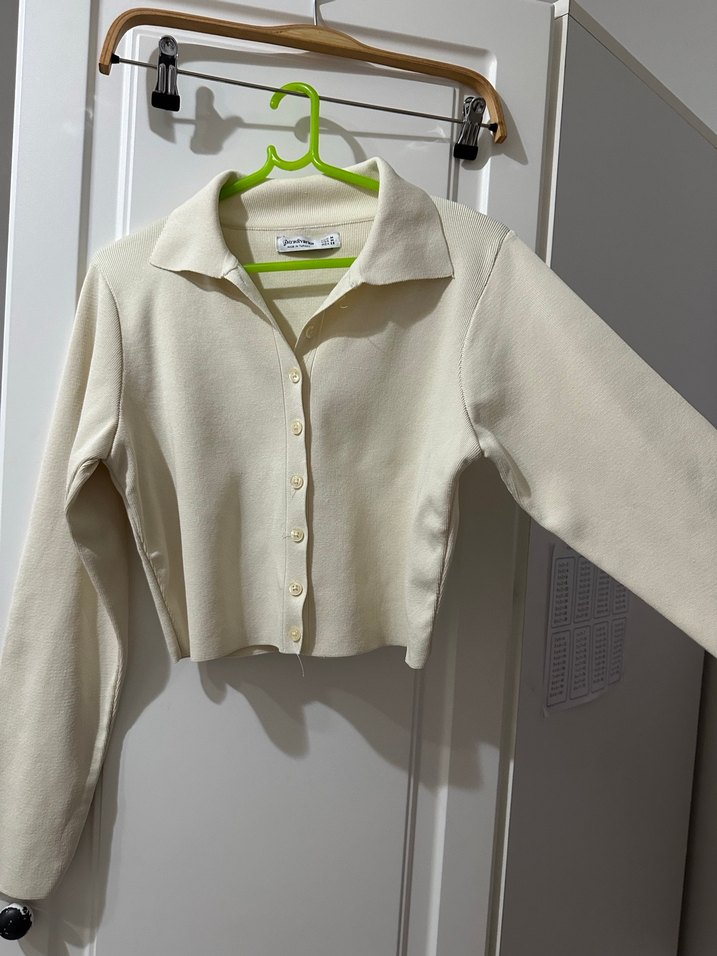 Stradivarius marka kadın üst. Krem rengi m beden ama xs ve s bedene de rahat bir şekilde olur. Neredeyse hiç giymedim.
