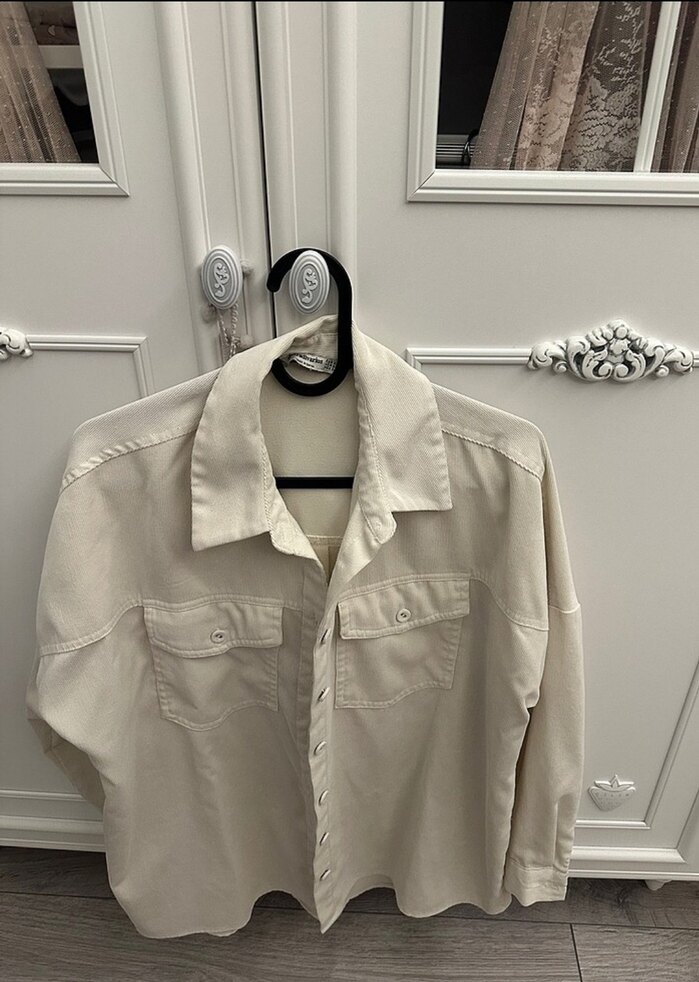Bej kadife kumaştan, düğmeli ve yakalı, uzun kollu salaş kesim gömlek. Minimalist sokak stiliyle günlük kullanıma uygun. Beden xs ama M bedene kadar dökümlü duruyor .Rengi kırık beyaz