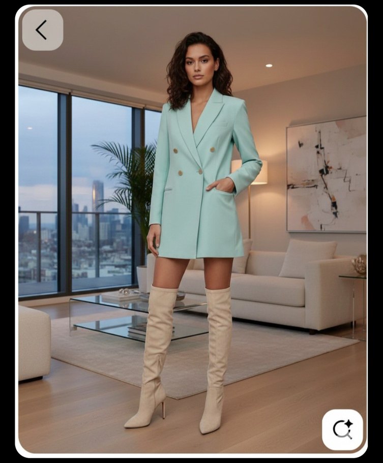 Turkuaz renkli, düğmeli, normal boy midi kadın blazer ceket. Uzun kollu, kesimi rahat ve satenimsi dokuda, partiler için uygun.
