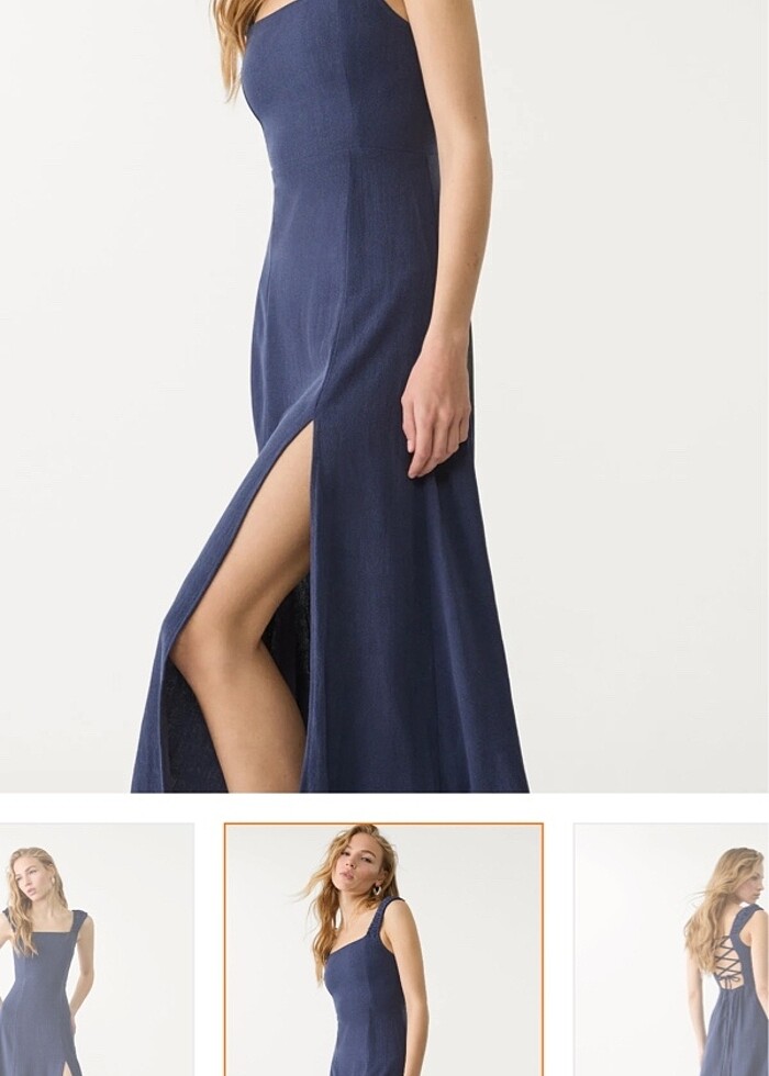 Lacivert keten arkası açık dökümlü elbise