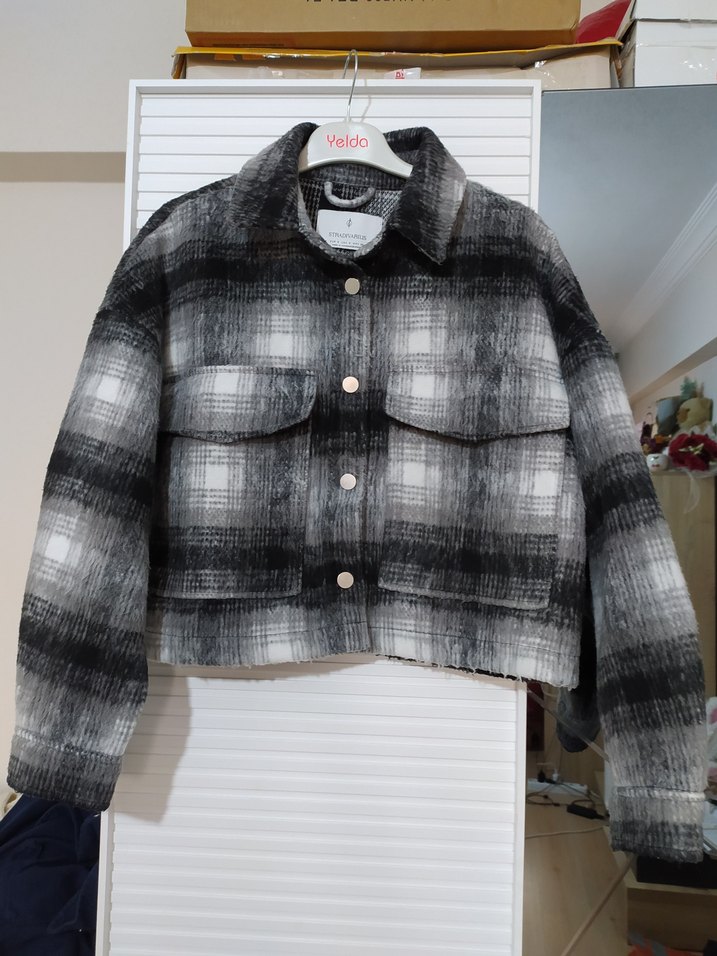 Düğmeli, uzun kollu, gri ekoseli kısa kadın gömleği. Notlu yakası ve rahat kesimiyle yumuşak, sıcak kumaştan yapılmıştır. hiç giyilmedi sorunsuz