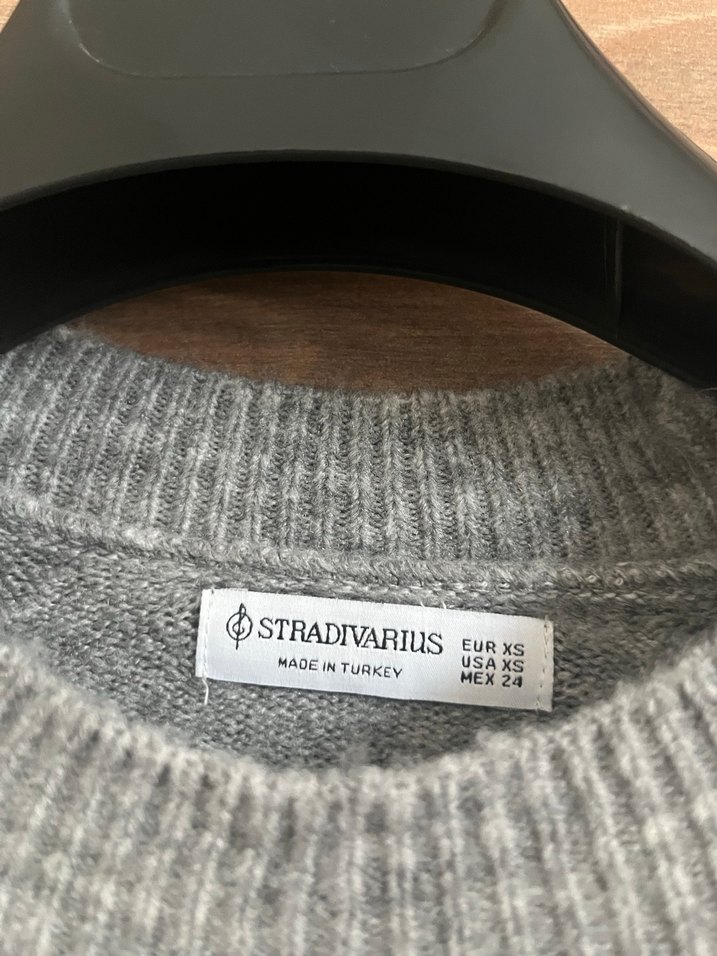 Stradivarius markalı, gri renkli, yün örme kumaştan yapılmış, bisiklet yaka ve uzun kollu, midi boy, dar kesim kadın kazak