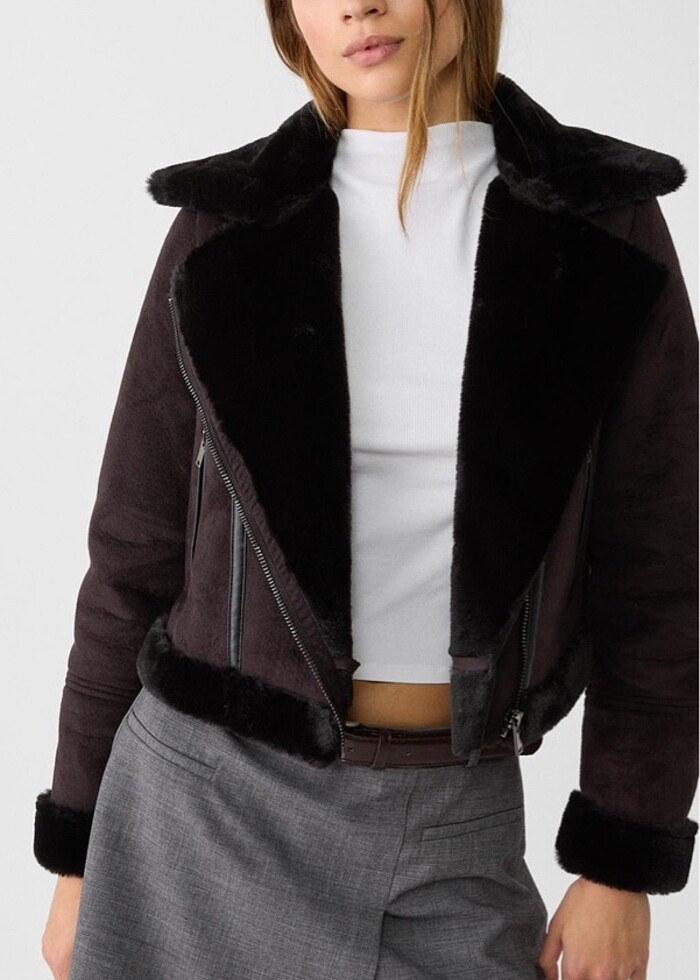 Stradivarius içi suni kürklü crop biker ceket