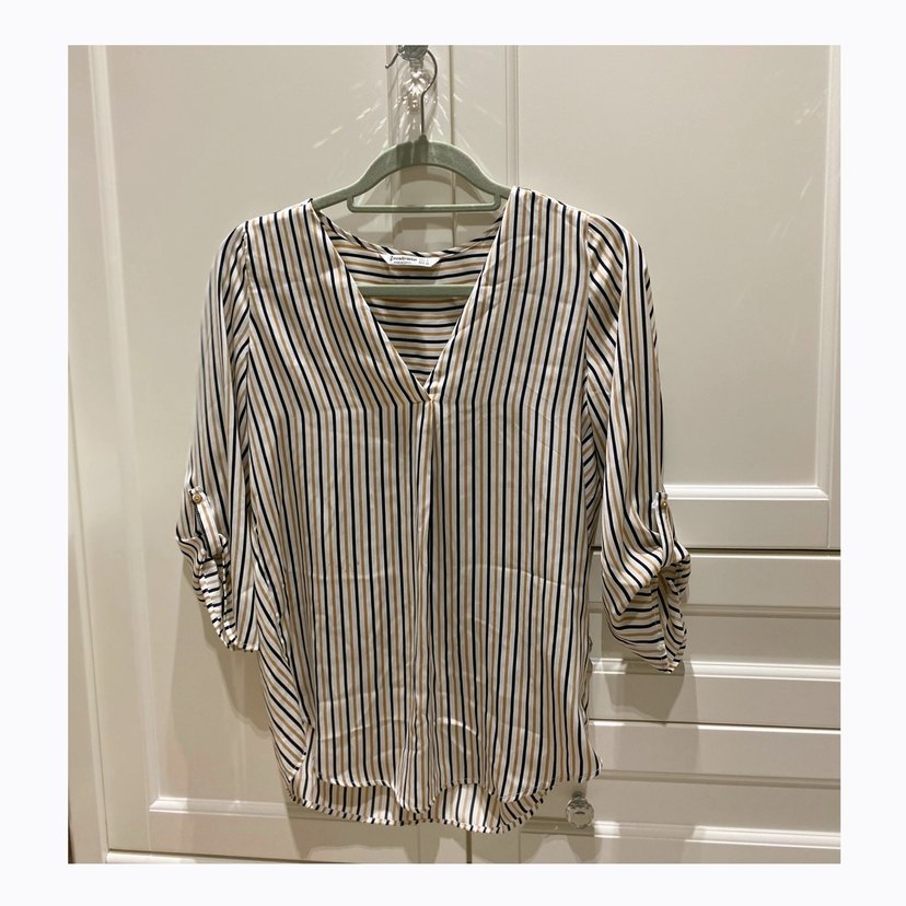 Stradivarius Uzun kollu, V yaka, bol kesim kadın gömlek. Bej ve siyah çizgili, pile detaylı, yumuşak sentetik kumaştan üretilmiştir. Günlük kullanıma uygundur. yeni gibidir. Gelen teklifler değerlendirilir.
