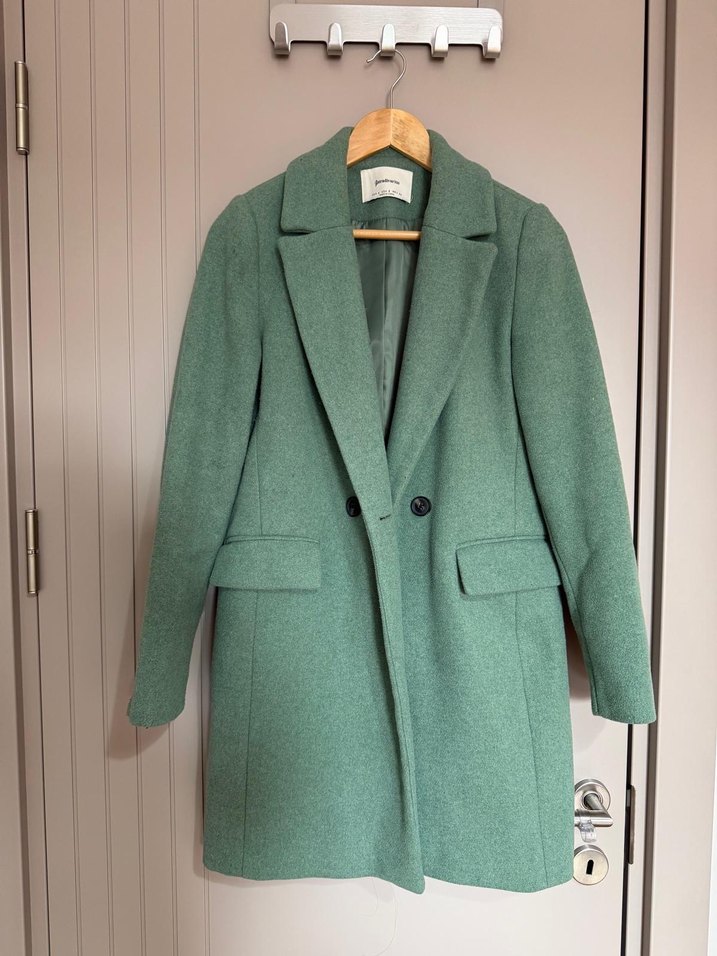 Yeşil renkte, çift düğmeli ve iki cep kapaklı kaban. Klasik yaka ve astarlı iç yüzeye sahiptir. Soğuk havalar için uygundur.