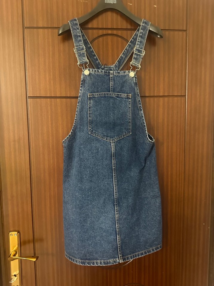 Ayarlanabilir tokalı askıları ve ön cepli, rahat kesim lacivert denim midi salopet. Askısız yaka detayıyla günlük şıklık sağlar.