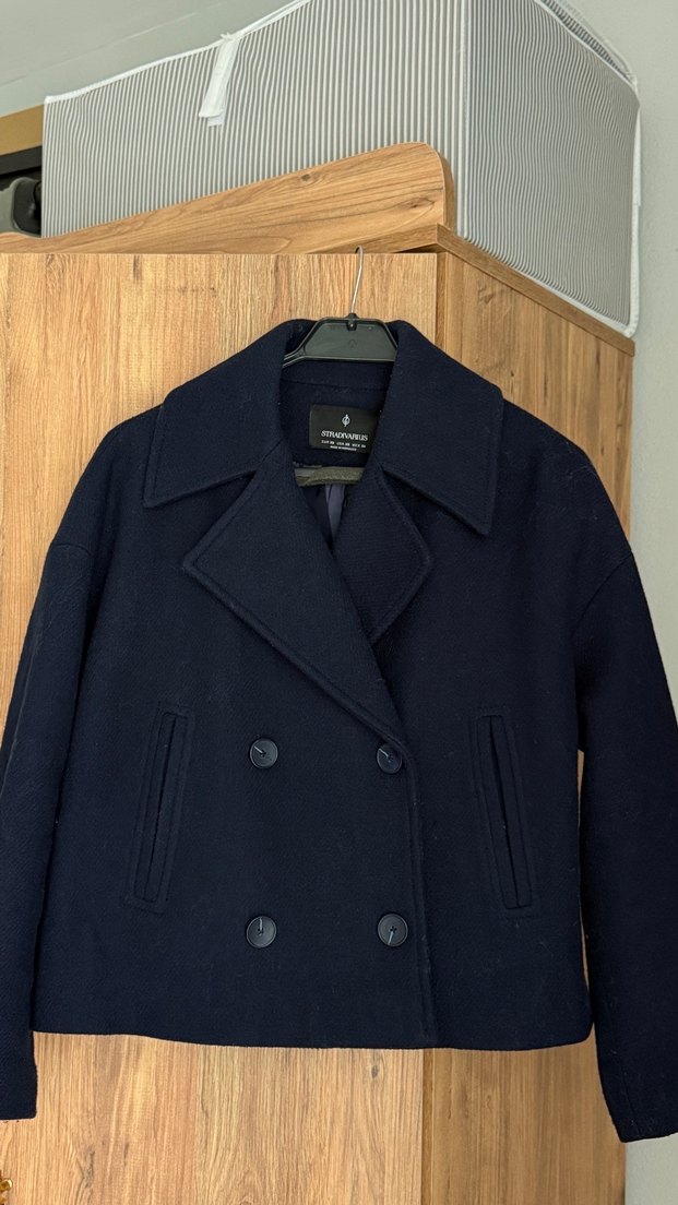 Lacivert yün kaban, düğmeli ön detaylara sahiptir. Normal kesim, uzun kollu ve midi boydadır. Sayılı giyildi, sorunsuz