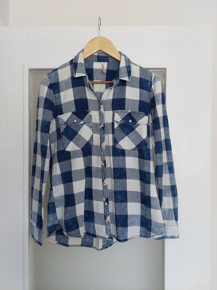 Düğmeli, uzun kollu, mavi ve gri kareli gömlek. Yakalı ve cepli, günlük kullanım için uygundur. Cok az kullanilmistir. #stradivariusgomlek #stradivarius