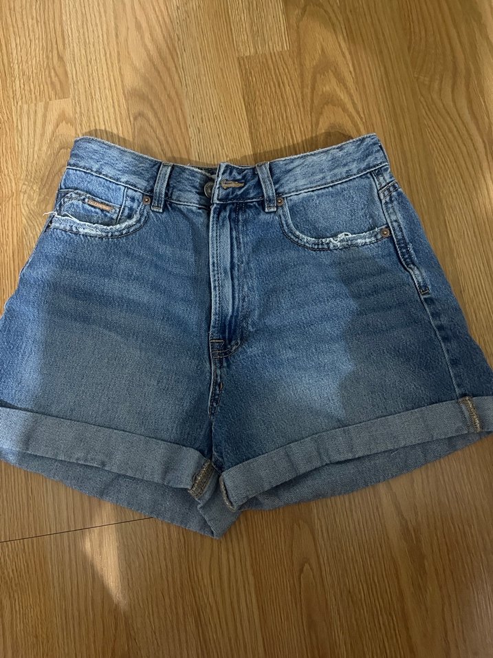 Pastel mavi renkli, bağcıklı detaylı, bol kesim kadın mini denim şort, rahat sokak stili için uygun.