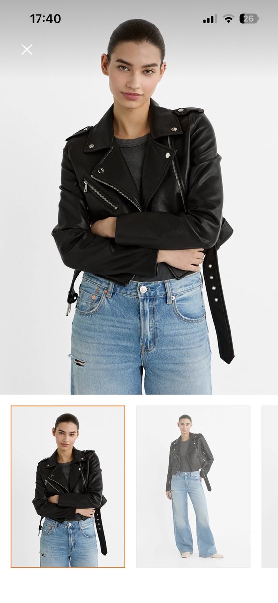 Siyah deri biker ceket, kesik yakalı, askılı kollu ve tokalı detaylara sahiptir. Normal uzunlukta ve regular fit, günlük kullanım için uygundur.
