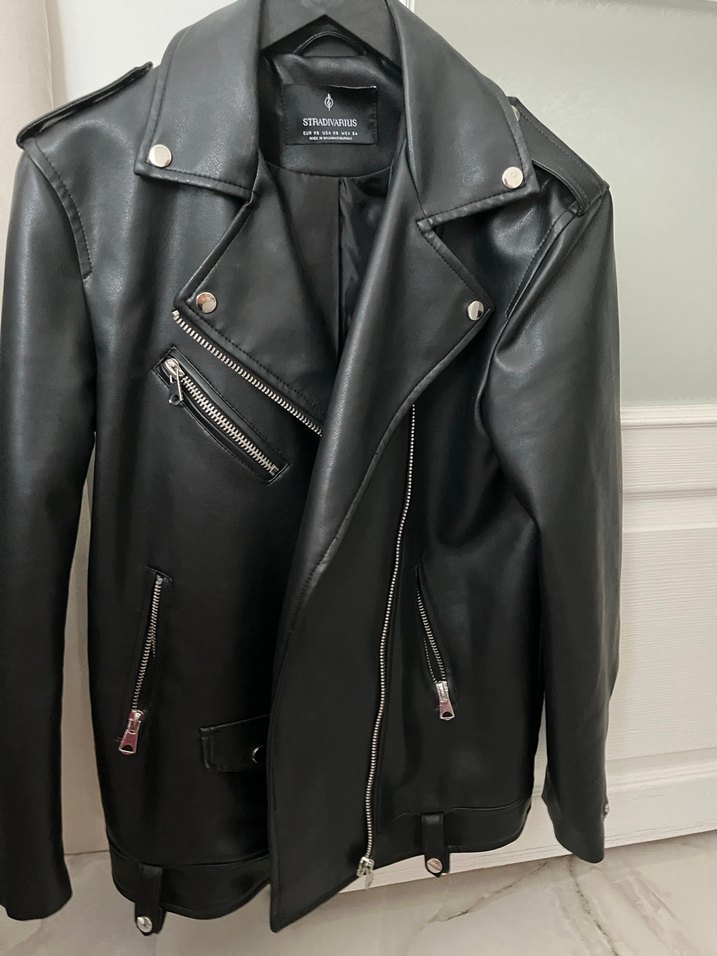 Siyah deri biker ceket, çıtçıtlı yakalı ve fermuarlı ceplerli. Strappy kollu, bomber kesim