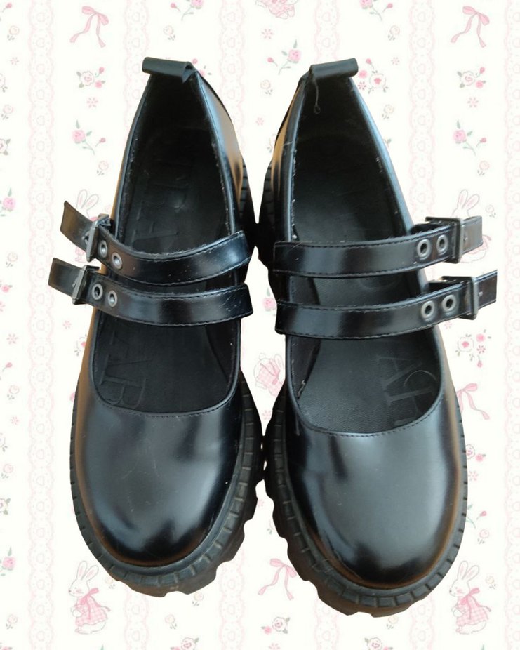 İki kemerli kayışlı siyah platform topuklu ayakkabılar, kauçuk malzemeden, gotik ve rock punk havası taşıyor. Günlük kullanım için uygun.