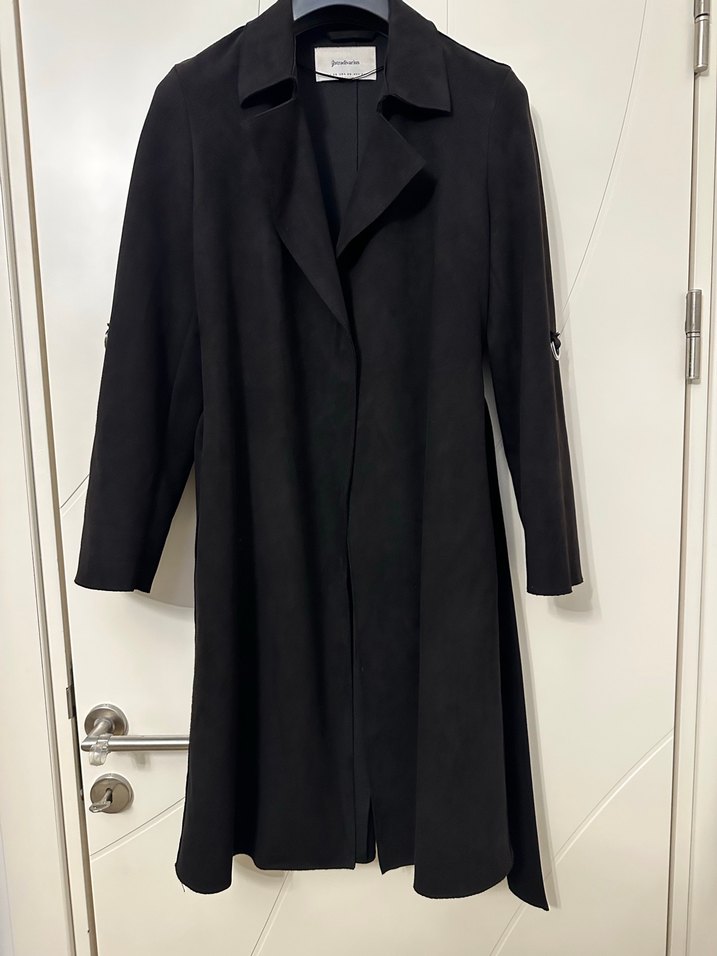 Xs Beden. Diz altı uzunlukta siyah süet trençkot. Sıcak tutar, bahar ayları için uygundur. Ürününün bir kusuru yoktur.