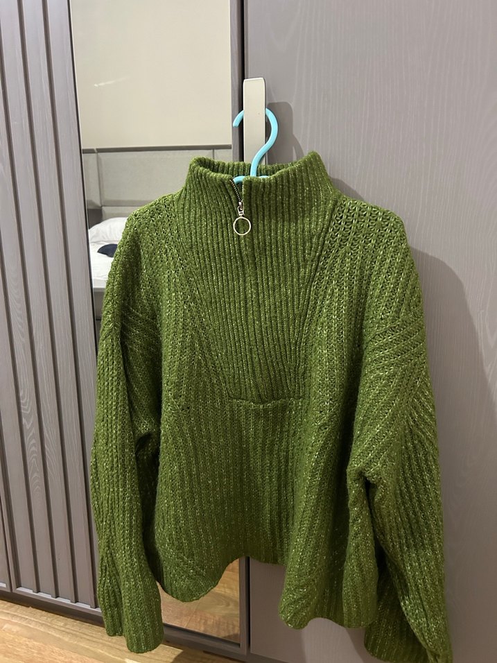 Oversize Bir süredir hiç giymiyorum bundan sonra da giymem diye düşündüğüm için satıyorum Güzel kullandım Deformesi yok Teklif verebilirsiniz Yarım fermuarlı, yüksek yakalı yeşil triko kazak. Uzun kollu ve bol kesim, rahat ve gündelik kullanıma uygun bir parça.