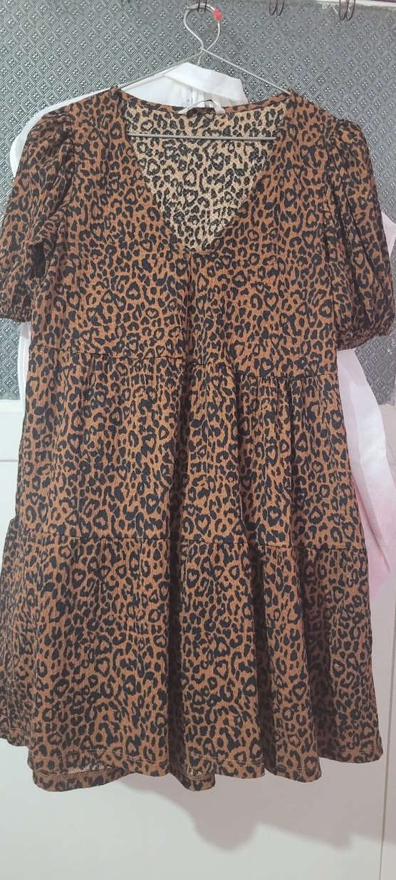 , V yakalı, kısa kollu, kahverengi leopar desenli, elbise. Yumuşak sentetik kumaştan, fırfır detaylıdır. Ürün sayılı giyildi yazlik tiril tiril sık bir elbise yeni gibi kolları lastikli s beden ama l bedene kadar olur Esnek kumas Ölçüleri fotoları mevcut