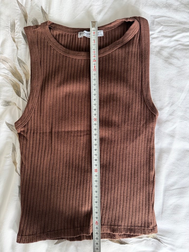 Kahverengi, yüksek yakalı, triko dokulu, vücuda oturan, kolsuz kadın atlet. Yumuşak Pamuk elastan kumaştan, minimalist günlük tarz için uygundur.