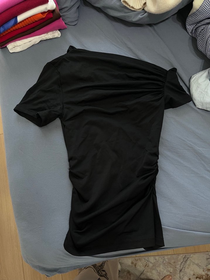 Drapeli, yarım kollu ve yüksek yakalı, siyah renkli, sentetik kumaştan yapılmış dar kesim kadın bluz. Sokak modası ve athleisure tarzlarına uygundur.