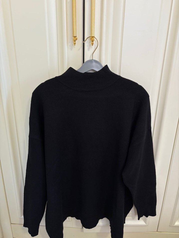 Yüksek yakalı ve uzun kollu siyah kadın kazak, rahat ve bol kesimdir. Midi boyda, yumuşak ve sıcak kumaştan yapılmıştır, desensiz ve gündelik kullanıma uygundur.