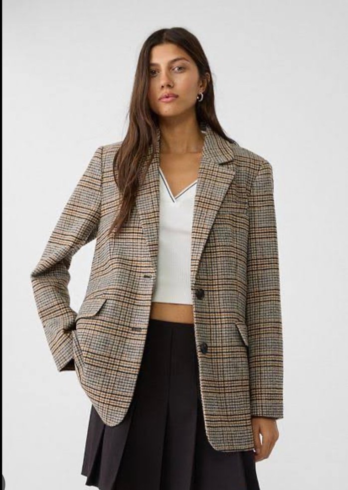 Düz kesim, ekose desenli kahverengi blazer, yakası kesik ve düğmeli uzun kollu, ofis için uygun, hiç kullanılmadı.