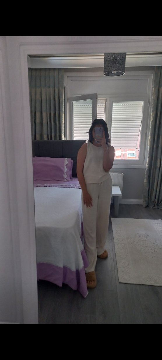 Stradivarius Keten Takım, çok az sayıda giydim, sadece fotoğrafta gözüktüğü gibi sol bacağında minik bir leke var muhtemelen yıkamayla gider. Günlük kullanım için rahat ve şık bir tercih.