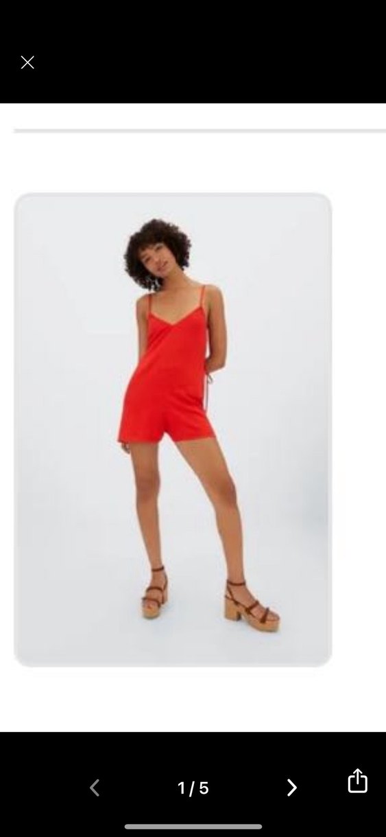 Kırmızı, V yakalı, kolsuz keten tulum. Salaş kesimi ve drapeli tasarımıyla minimalist bohem tarzı sunar. ✨ 1-2 kes giyildi defosuz