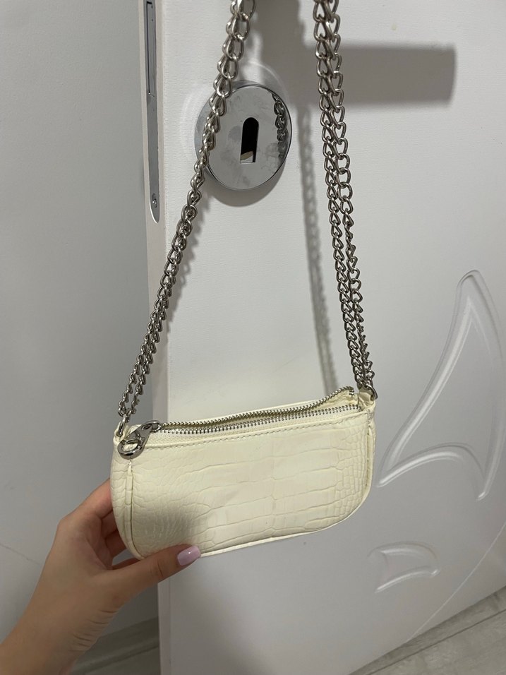 Beyaz deri, yılan derisi deseni ve zincir detaylı bu çanta, günlük kullanıma uygun minimalist ve şık bir tarza sahiptir.