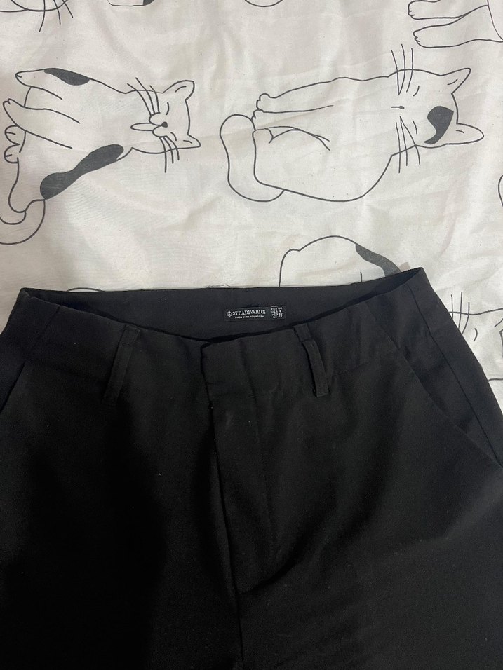 Kadınlar için siyah midi kumaş pantolon, normal kesim ve minimal normcore tarzda. Düz ve yumuşak sentetik kumaştan, ofis için rahat şıklık sunar.