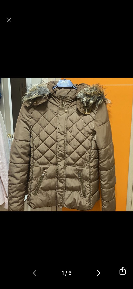 Kahverengi, kürk detaylı kapüşonlu, fitted kesim, kapitone desenli sentetik kumaştan kadın kışlık mont. Notch yaka ve uzun kolludur.