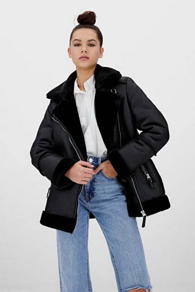 Stradivarius Kürk Detaylı Siyah Deri Biker Ceket