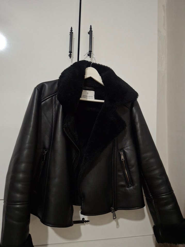 Stradivarius Kürk Detaylı Siyah Deri Kadın Biker Ceket