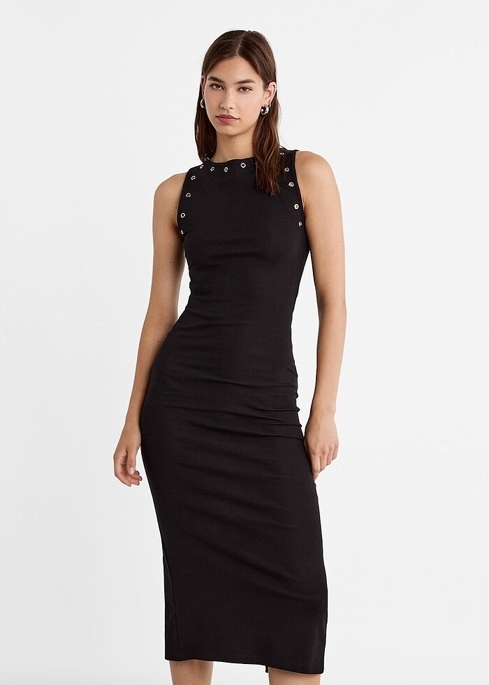 Arka kenarı yırtmaçlı metal kuş gözü aplikeli bisiklet yaka kolsuz vücuda oturan midi elbise