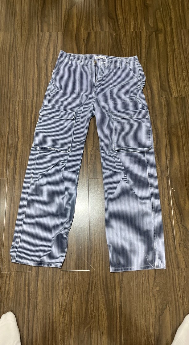 Lacivert ve çizgili, detaylara sahip bol kesim kadın kot pantolon. bol kesim, günlük rahat ve sokak stili için uygun. bana bol geldiği için satıyorum