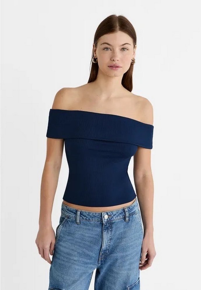 Stradivarius Madonna Yaka Lacivert Omzu Açık Bluz