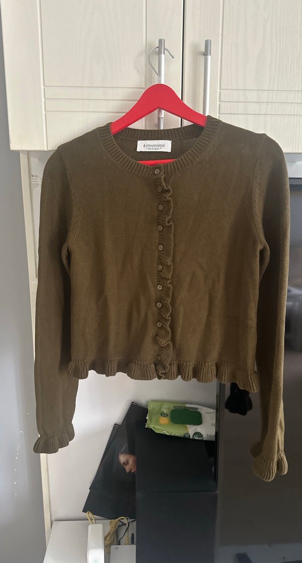 Düğmeli, uzun kollu, kruvaze yaka haki renk triko hırka. Kenarlarında ince fırfır detaylı,M beden, hiç kullanılmadı.