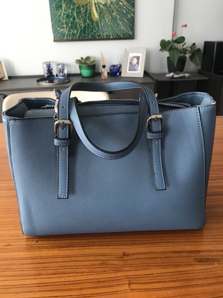 Az kullanıldı Mavi deri, tokalı ve desensiz kadın çantası, modern ve şık tasarım sunar. İş ve günlük kullanım için uygundur.