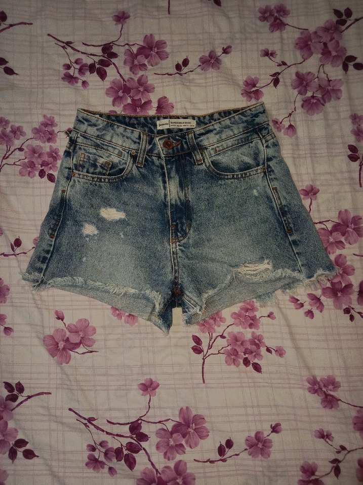 Düğmeli ve yırtık detaylı, bol kesim kadın denim şort.İkinci fotoğraf da gözüktüğü gibi tek sorunu kemer kopçalarından biri kopuk.Başka herhangi bir sorunu yok