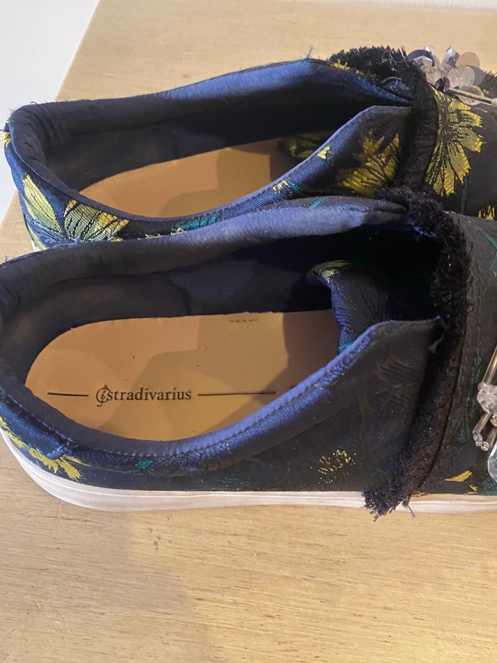 Stradivarius marka, koyu mavi nakışlı sentetik kumaştan kadın spor ayakkabısı. Bohem tarz, platform topuk ve cırt cırtlı kapanışa sahip, romantik akşamlar için uygun.