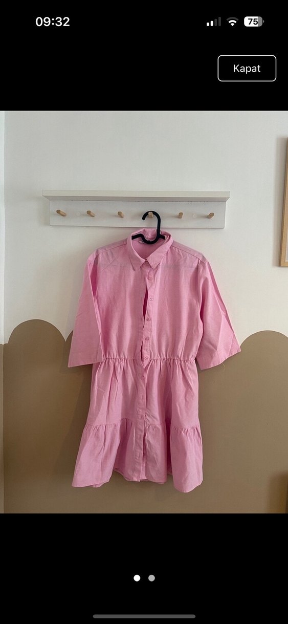 Pembe keten midi gömlek elbise, yakalı, düğmeli ve kısa kollu, rahat kesimli, günlük kullanıma uygun şık bir parça.
