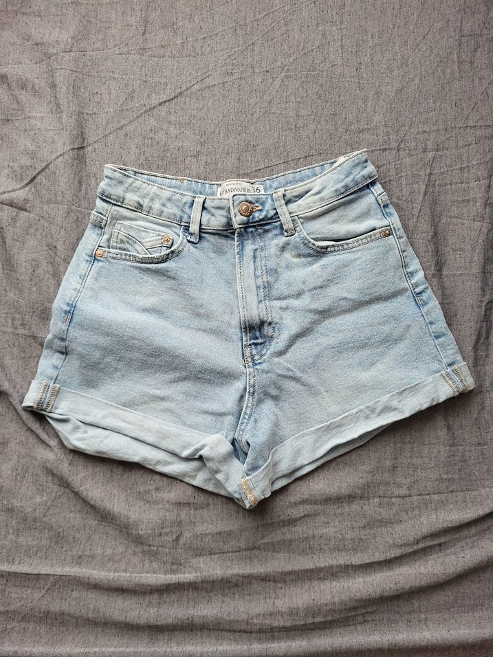 Gevşek kesim, açık bej-gri tonlarında mini kot şort. Günlük rahatlık için dayanıklı denim kumaştan üretilmiştir.