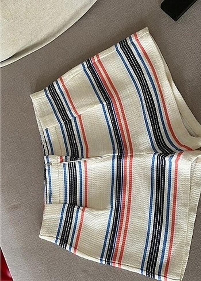 36 beden çizgili tok kumaşlı kırışmaz krem rengi mini şort. Pensli olduğu için bollaşıyor ve çok şık duruyor.
