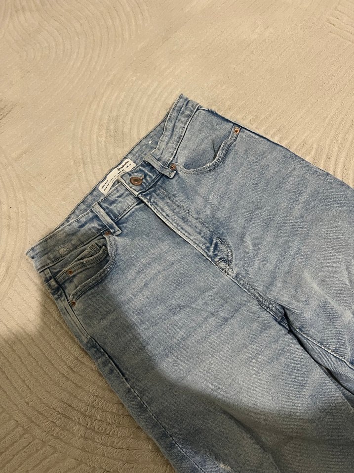 Düğmeli ön kapamalı, midi boy, regular fit mavi kot pantolon. Minimalist ve gündelik kullanıma uygun düz tasarım.