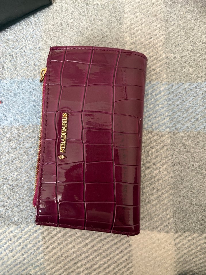Parlak deri ve yılan desenli, fermuarlı bordo kadın cüzdanı, günlük kullanıma uygun modaya uygun bir tasarıma sahiptir.