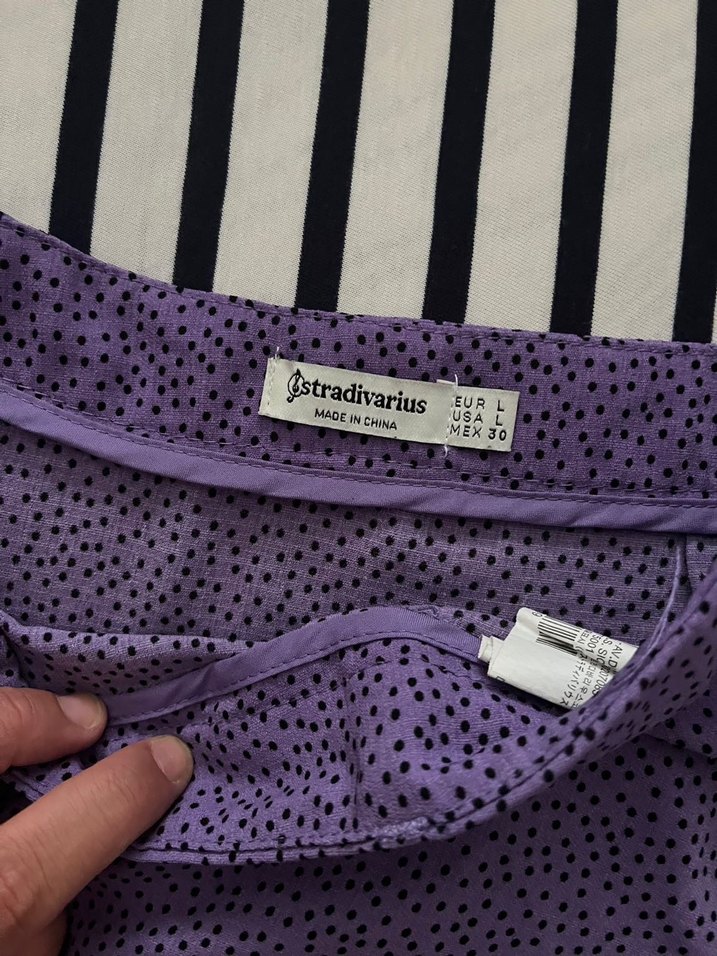 Stradivarius markalı, mor renkli, desenli ve düğmeli, midi boy hamile eteği. Sentetik kumaştan, sokak modasına uygun, günlük kullanıma uygun şık ve dar kesim. Tüm ürünlere tek tek fiyat verilecektir