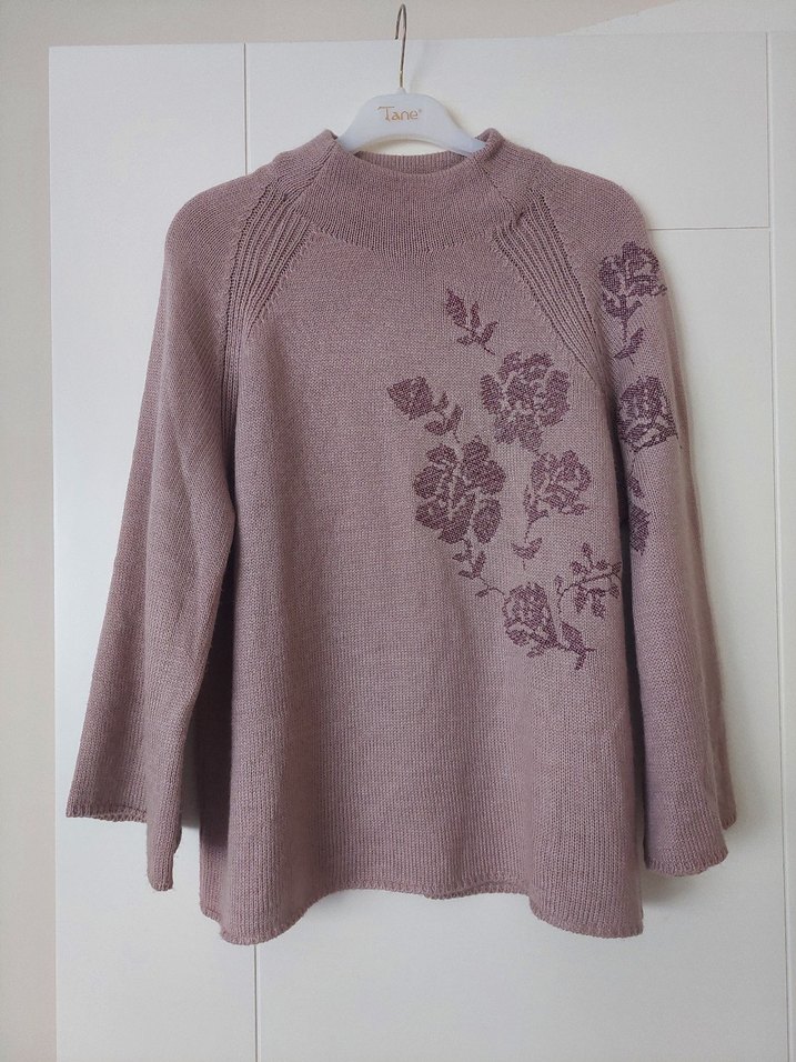 Gül kurusu renkli, yüksek yakalı triko kazak, önünde nakışlı çiçek desenleri bulunur. M / 38 beden. Hafif tülermesi dışında gayet iyi durumda. Tesettüre girdim, bana göre kalçayı yeterince kapatmadığı ve kolları açıldığı için satıyorum.