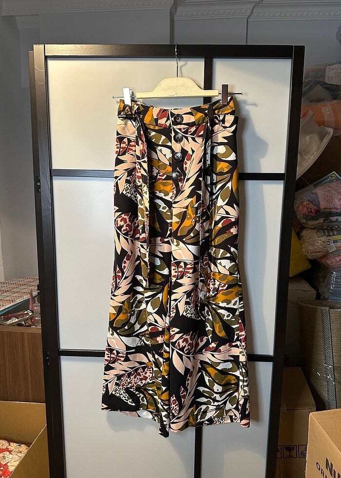 Beli kemerli, arka kısmı lastikli, önden 3 düğmeli, boyu bilekten biraz daha yukarıda